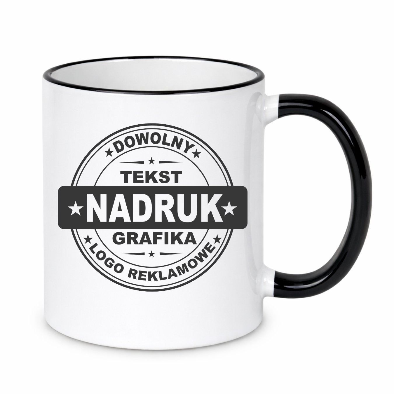 Kubki reklamowe – białe z czarnym rantem i uchem, 330 ml