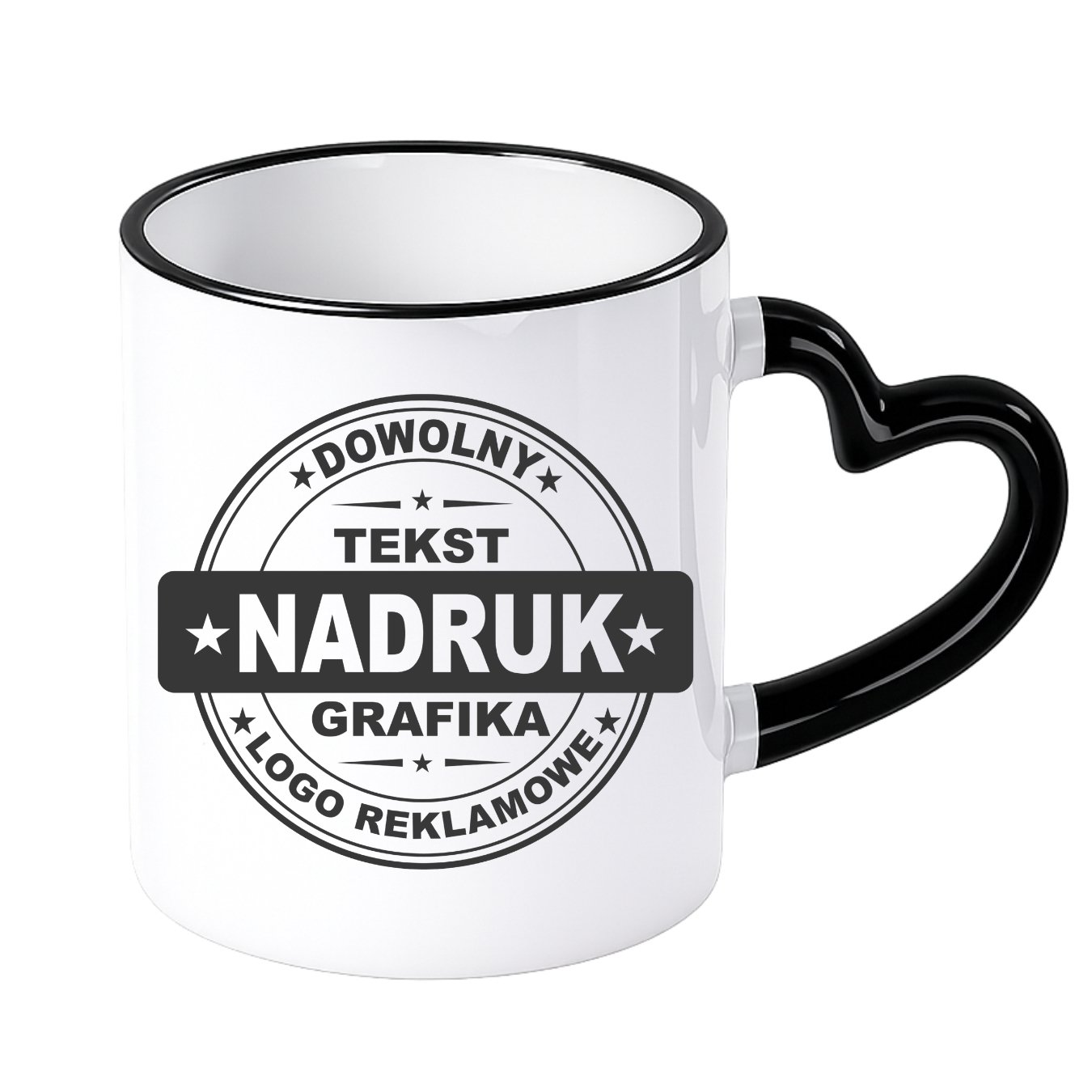 Kubki reklamowe – białe z czarnym rantem i uchem w kształcie serca, 330 ml