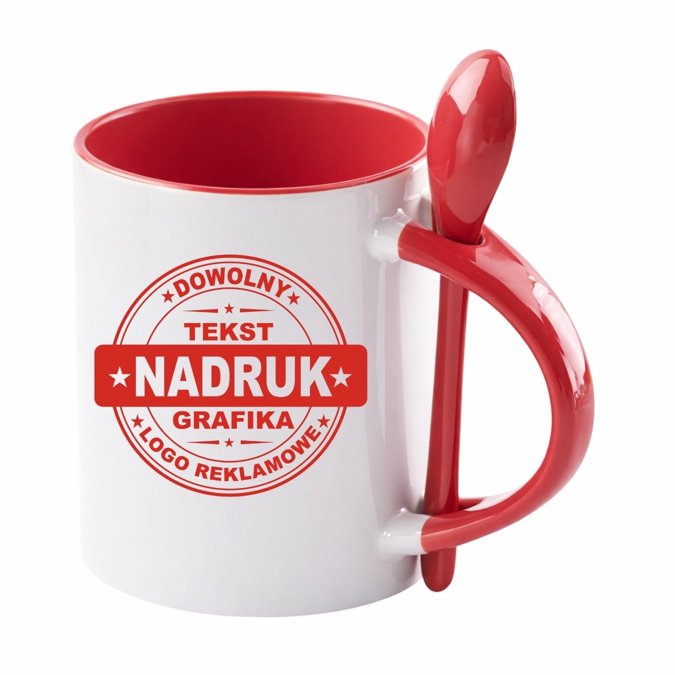 Kubki reklamowe – białe z czerwonym wnętrzem, uchem i łyżeczką, 330 ml
